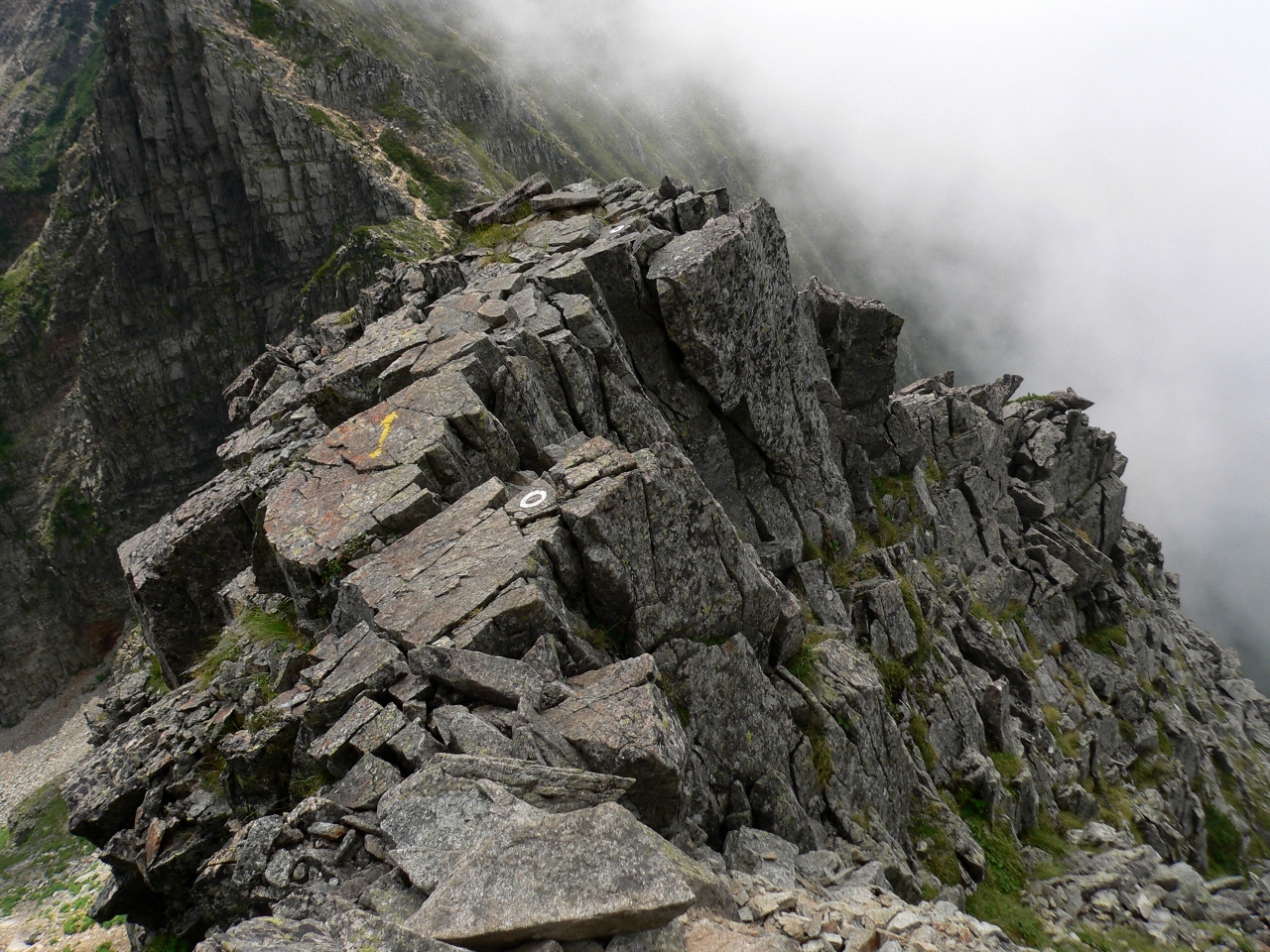 切れ落ちたヤセすぎたピークの御登場で、登山道の目印はこの上を