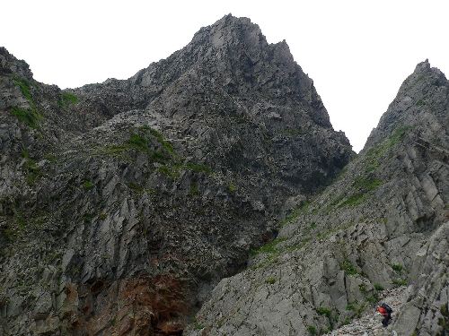 天狗のコルから少し下って振り返りました。天狗岳の垂直壁の様子が